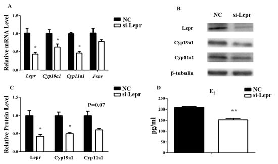 To determine if the observed biological activity of leptin on steroidogenesis required interaction with Lepr, the expression levels of Lepr, Cyp19a1, Cyp11a1, and Fshr were measured before or after the silencing of Lepr by siRNA in the presence or absence of leptin. Lepr siRNA treatment suppressed the leptin-stimulated upregulation of Cyp19a1, Cyp11a1, and Fshr (p < 0.05, Figure 2), as evident by comparison to cells without Lepr siRNA treatment in the presence of leptin. The results indicated that Lepr siRNA treatment weakened the leptin contribution to regulation of E2 synthesis-related genes.