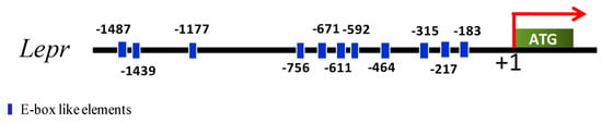 Schematic representation of the porcine Lepr gene promoter. Eleven E-box like elements are located upstream of the promoter.