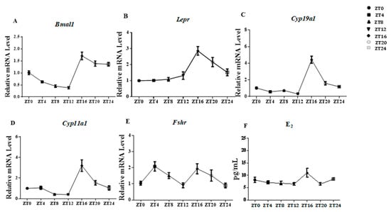 The expression patterns of Bmal1, Lepr, Fshr, Cyp19a1, and Cyp11a1 genes in ovarian cells were found to exhibit circadian rhythms within the 12 h light/12 h dark cycle, as did the serum E2 concentration. All patterns were well-synchronized, and peaked at ZT16 (dark period). Thus, the findings suggested the involvement of Lepr in E2 synthesis and that this physiological process might be regulated by the circadian system.