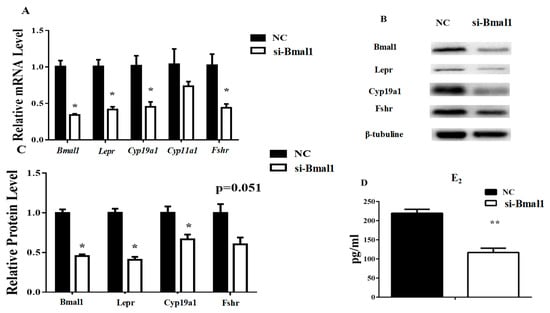 Cellular proteins were extracted from ovaries and cultured granulosa cells with RIPA (Applygen Technologies Inc., Beijing, China) supplemented with 1 mM PMSF serine protease inhibitor. The protein content was measured using a BCA Protein Assay Kit according to the manufacturer’s guidelines (CWBIO, Beijing, China). Western blotting was conducted as described in a previous report []. A total of 20 micrograms of protein was electrophoresed on a 12% SDS-polyacrylamide gel and transferred to PVDF membranes. The levels of the Bmal1 and other proteins involved in Lepr function and E2 synthesis were measured using specific antibodies. Antibodies against Bmal1 (1/500; sc-365645, Santa Cruz Biotechnology, Inc., Santa Cruz, CA, USA), Lepr (1/500; ab5593, Abcam, Inc., Cambridge, MA, USA), Fshr (1/1000; ab75200, Abcam, Inc.), Cyp19a1 (1/1000; ab124776, Abcam, Inc.), and Cyp11a1 (1/500; #14217, CST, Inc., Danvers, MA, USA) were used to detect the levels of these proteins in granulosa cells.
