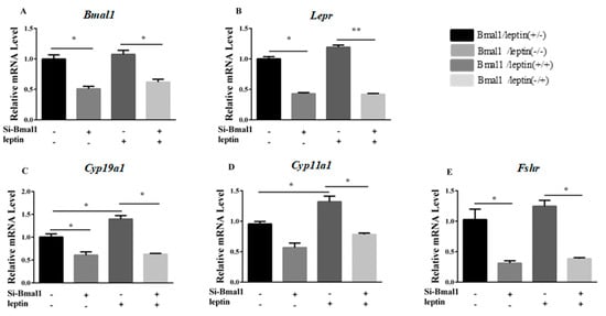 We next asked if leptin is required for the observed effect of silencing Bmal1. To determine if Bmal1 is involved in the hormone synthesis process that is promoted by leptin, granulosa cells were cultured with Bmal1 siRNA for 24 h and then treated with 0.5-ng/mL leptin for 24 h. The results showed that Bmal1 siRNA prevented the leptin-promoted upregulation of Lepr, Cyp19a1, Cyp11a1, and Fshr (p < 0.05, Figure 7A–E).