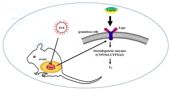 Female fertility depends on a functional circadian system, which has an intimate association with the reproduction processes []. At the molecular level, the circadian clock is composed of a network of transcription-translation feedback loops. Heterodimers of Clock (circadian locomotor output cycles kaput) and Bmal1 bind to E-box elements on the genome to activate the transcription of a number of clock control genes []. These clock control genes are expressed and coordinate with rhythmic physiological functions in cells and tissues []. Bmal1 is the key gene of this oscillator, and its deficiency results in severe clock disruption, which has been associated with decreased fertility [,,,]. The extent of illumination as well as exposure to light at night can cause circadian clock dysfunction, which increases rates of menstrual disruption, odds ratio, and subfertility in women []. However, the details of the regulation of steroidogenesis by the circadian clock have not been determined.