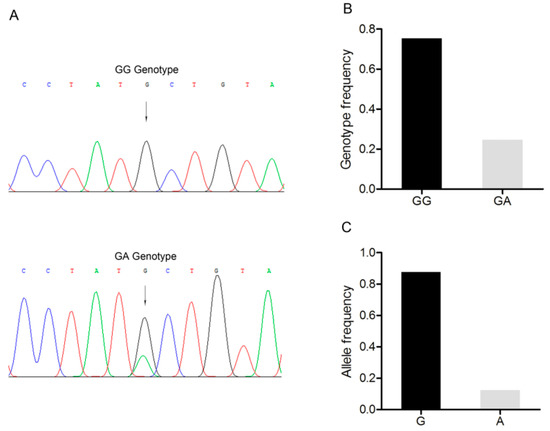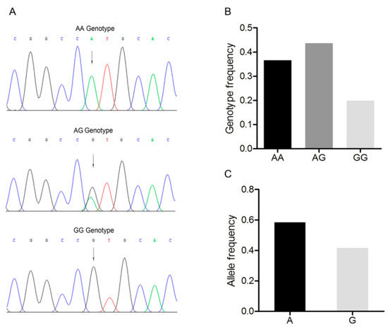 An A/G point mutation site was detected in this region and designated as c.1569A>G (Figure 2A). Three genotypes, AA, AG, and GG were discovered in the Large White pig population (Figure 2A,B). A was the dominant allele with a frequency of 0.600, and AG was the dominant genotype with a frequency of 0.449 (Figure 2C). The Chi-square test indicated that this single nucleotide polymorphism fitted the Hardy–Weinberg equilibrium (p > 0.05).