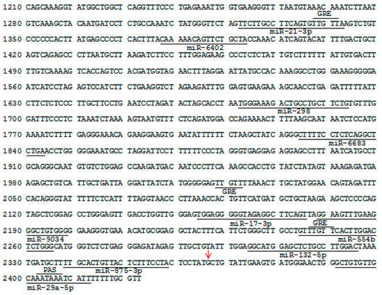 We next isolated a 1213-bp sequence of the 3’-UTR of BMP15 gene from the Large White pig (Figure 3) and found that this was also a gene containing a PAS motif. The partial sequence contained three classic GU-rich element (GRE; UUGUU) motifs located at c.1337/1341 (GRE1), c.2018/2022 (GRE2), and c.2246/2250 (GRE3), and a PAS motif located at c.2402/2407 (the transcription start codon of the porcine BMP15 was assumed as +1), but ARE motifs were not detected. Furthermore, ten target sites of miRNAs were detected in the partial 3’-UTR sequence, such as miR-21-3p (c.1322/1342), miR-298 (c.1672/1693), miR-17-3p (c.2154/2175), miR-132-5p (c.2204/2225), and miR-29a-5p (c.2391/2412).