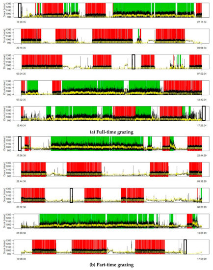 Examples of individual feeding behavior during 24 h for (a) full-time grazing and (b) part-time grazing with ingestion (green), rumination (red), and idling (white) bouts. Vertical black-lined boxes represent milking events.