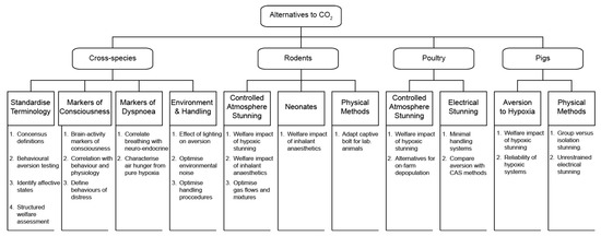 This research strategy is an initiative of the Swiss Federal Food Safety and Veterinary Office (FSVO) aimed at determining research priorities to identify and implement alternative stunning methods for live animals, specifically: mice, rats, pigs, and poultry. Whilst specific issues relating to carbon dioxide are discussed, it is not intended to be a comprehensive literature review on carbon dioxide stunning. Furthermore, this article is not an exhaustive list of research questions. Here, we focus on identifying humane methods to render animals unconscious prior to killing, rather than the methods of killing (Figure 1).
