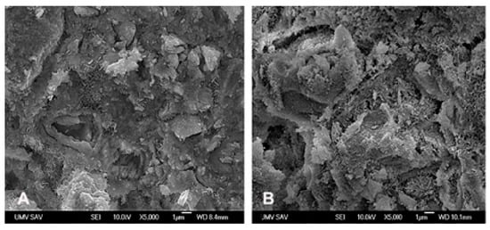 Microstructures of cements after hardening in simulated body fluid. (A) Irregularly shaped micropores with 1–5 µm size, larger agglomerates of 1–3 µm size composed of fine submicrometric globular particles and thin plate-like hydroxyapatite particles up to 500 nm length in C cement; (B) bigger micropores up to 10 µm dimension as a result pulling out of coarser calcium phosphate agglomerates from microstructure in CAK cement.