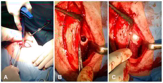 Surgical procedure. (A) Inducing of articular cartilage defect with osteochondral autograft transfer system (OATS) equipment, (B) Preparing articular cartilage defect in femoral trochlea before implantation, (C) Inserting of scaffold into prepared articular cartilage defect.