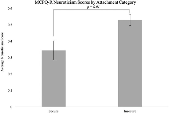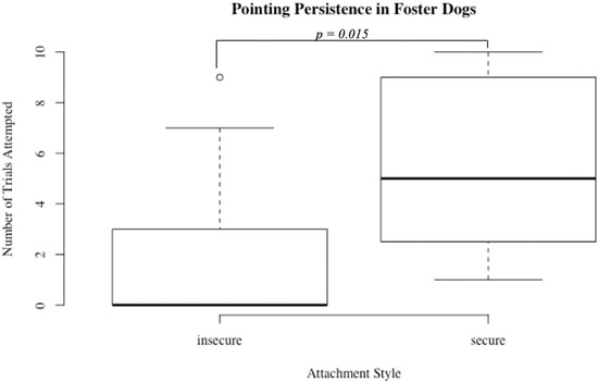 All statistics were two-tailed with an alpha level of 0.05 unless otherwise noted. Pointing score data and measures of persistence on both cognitive tasks were non-normally distributed. Normality was evaluated using a Shapiro–Wilk test, all p < 0.05. A Shapiro–Wilk test was used to assess normality for subcategories on the MCPQ-R and the C-BARQ. For the MCPQ-R, extraversion, motivation, training focus, and amicability were normally distributed, all p > 0.05. The MCPQ-R subcategory of neuroticism was non-normal, p < 0.05. Additionally, t-tests with a Tukey–Kramer adjustment for pairwise comparisons were used for all data, as most categories were normally distributed, and t-tests are robust to violations of normality. We also assessed differences between groups (shelter vs. foster) and differences between attachment styles (secure vs. insecure) on each MCPQ-R trait using t-tests with a Tukey–Kramer adjustment for pairwise comparisons. All C-BARQ trait data of interest were non-normally distributed (Shapiro–Wilk, p < 0.05), therefore non-parametric Mann–Whitney U tests were used for analyses of C-BARQ data.