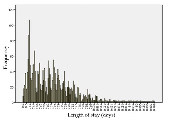 Frequency distribution of length of stay for 2584 cats adopted from an urban shelter.