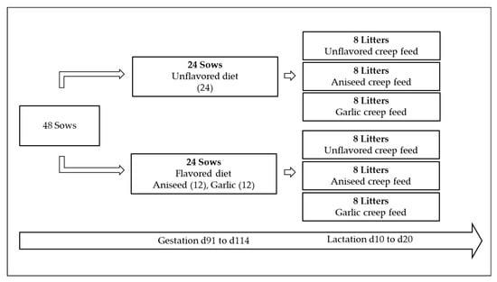 On day 112, sows were placed in farrowing crates and stayed in there up to weaning time. Both sows and piglets were individually identified using plastic ear tags. Starting from an age of 10 days and up to day 20, piglets were provided with ad libitum access to experimental creep feed diets by using pan feeders. No additional oral treatment that could possibly change the perception of flavors was given. During the lactation period, following a farm’s usual feeding routine, sows were fed twice a day with a commercial, unflavored diet, considering the maximum consumption expected according to litter size and the sow’s body condition. Sows and piglets were also allowed ad libitum access to fresh water, which was delivered by nipple drinkers throughout the whole experimental period. Once the experiment ended, all pigs continued the normal production cycle of the farm.