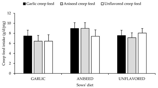 Daily intake of creep feed diet by piglets (days 14 to 18), who were offered (from days 10 to 20 of the suckling period) according to late-gestation maternal diet (GARLIC, ANISEED OR UNFLAVORED) and creep feed diet (Garlic, Aniseed or Unflavored). Results expressed as Least Square means ± SEM.