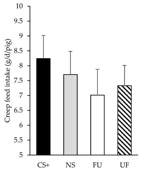 The distinctive variability among litters makes quite difficult to find significant results for consumption of creep feed diets [6,8,23]. Such variability may be partially explained by size and weight, as those piglets that are smaller and lighter than their siblings eat more of their creep feed ration, so that they can manage to satisfy their energy requirements, hence compensating for the problem of lesser access to milk [6,24]. Interestingly, some evidence shows that weaning age in piglets has an effect on their actual intake of creep feed diets. For instance, researchers have reported that suckling piglets begin showing real signs of interest in solid feed after reaching 22 days old [23]. However, previous experiments showed the benefit of initiating creep feed from day 5 and 10 [9,25]. Consequently, in our experiment, creep feed was added from day 10 until day 20, as that mirrors the current practice of Chilean pig farmers, who wean their piglets after 21 days of nursing. However, European welfare regulations currently propose a weaning age of 28 days to allow that the animals increase their intake of creep feed diets, thus favoring the proper development of their digestive tract [5] and preparing pigs physiologically—as well as in terms of helping them memorize the characteristics of solid feeds—to endure the stress of weaning [15]. But this strategy seems to have some drawbacks, as it was reported by Blavi et al. [16], who found a lower intake in piglets when the formulation of creep feed diets included the same artificial flavors than the late-gestation maternal diets had, even when the nursing period was extended up to 28 days.