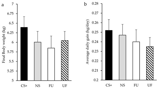 Final Body weight (a) and average daily gain (b) of piglets who were offered (from days 10 to 20 of the suckling period) either the same flavor in their diet than their mothers in the late-gestation (90-114d; CS+), a different flavor (NS), an unflavored creep feed diet (FU), or a flavored creep diet, but born from a mother that was fed an unflavored maternal diet (UF). Results expressed as Least Square means ± SEM.