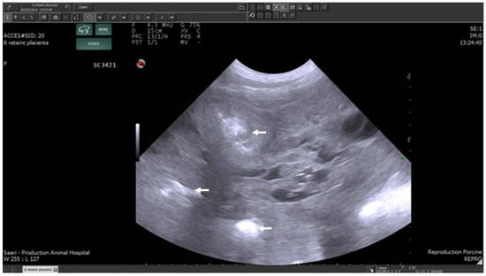 Additional work has shown an association between duration of farrowing and puerperal complications [31]. Sows with a prolonged duration of farrowing (i.e., >6 h) had a higher incidence of partially or completely retained placentae (Figure 2), with complete placental retention observed in up to 6% of cases. Incidentally, administration of oxytocin after the expulsion of the last piglet was found to be beneficial in reducing the occurrence of retained placentae [31]. Along with the aforementioned puerperal events, prolonged farrowing and related uterine complications have been associated with disruption in the animal’s future fertility potential. In a study involving 148 crossbred sows, prolonged farrowing clearly increased the risk of repeat breeding in the following post-weaning cycle [32]. In another study, uterine involution in loose housed and crated sows was assessed in relation to subsequent farrowing production parameters [33]. Sows were transabdominally imaged to obtain uterine horn diameter daily between days 2 and 14 post-farrowing, and the day before weaning (e.g., 28 day lactation). Overall, both loose housed and crated sows showed similar reductions in uterine horn diameter at day 2 (loose housed: 32.4 mm; crated: 38.5 mm) and the day before weaning (loose housed: 9.0 mm; crated: 10.1 mm). Interestingly, at day 11 post-farrowing, a negative correlation was found between uterine diameter and subsequent farrowing total born and live born piglet numbers, albeit only in loose housed sows. Specifically, odds ratios for having more than 16 total born and more than 15 live born increased by 2.2 and 1.4, respectively, in animals exhibiting a uterine horn diameter of 12 mm or less compared to those with larger uterine diameters. Collectively, this body of work suggests that RTU imaging of the puerperal sow may provide added value in forecasting subsequent fertility potential.