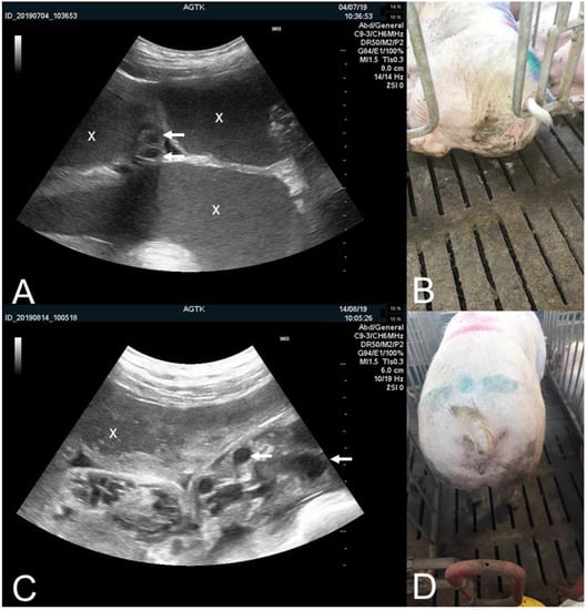- Knox, R.V.; Probst-Miller, A. Evaluation of transrectal real-time ultrasound for use in identifying sources of reproductive failure in weaned sows. J. Swine Health Prod. 2004, 12, 71–74. [Google Scholar]