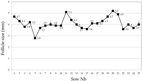 Follicle size of primiparous sows (n = 25) as determined by transabdominal ultrasonography one day post-weaning after 28 days of lactation [42].