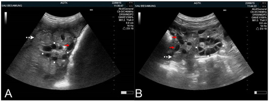 Transabdominal ultrasonographic image of cross sections of uterine horns of a sow on post-partum day 3 with retained placentae, as indicated by intrauterine hyperechogenic material (arrows). Scale bar on right margin in 1.0 cm steps [30].