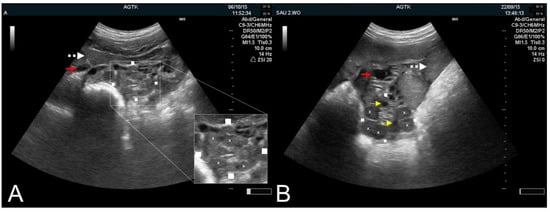 Applications of RTU peripartum have been described as well. Doppler RTU to assess fetal heart rate (FHR) antepartum is a good predictor of fetal viability [26], with serial ultrasound showing decreases to FHR within the last 10 days of gestation [27]. From an obstetrical standpoint, peripartum RTU can be useful to determine if a sow has retained piglets, along with their viability status via FHR (Figure 1) [28]. Peripartum visualization of the ovaries for the presence of non-regressed corpora lutea (CL; refer to Section 3.2. and Figure 7B) can alert farrowing personnel to a sow that may exhibit prolonged parturition and reduced colostrum production due to the presence of a higher than normal progesterone concentration [7]. Lastly, RTU can be used to correctly identify stillborn piglets through thoracic assessment of the lung tissue, where piglets born alive have ventilated lungs which ultrasonographically differ quite remarkably in echotexture from that of non-ventilated lungs [29].