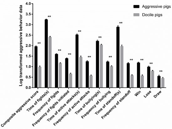 The log transformed aggressive behavioral indicators within 36 h after mixing between aggressive pigs (n = 102) and docile pigs (n = 102). ** p < 0.01.