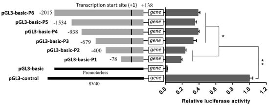 Luciferase assays for porcine MAOA promoter activity. Six luciferase reporter plasmids expressing successive truncations of the MAOA promoter sequence were constructed and transfected into 293T cells. The resulting firefly luciferase activity was normalized to Renilla luciferase activity and the relative values were presented as fold induction over the activity of the pGL3-basic vector. The basic activity value of negative control pGL3-control was set as 1. The location of each 5′-deletion sequence was indicated at the left of each bar. The relative luciferase activity values represent the mean ± SEM of three independent experiments. Statistical differences in luciferase activity were assessed using the one-way ANOVA analysis, * p < 0.05, ** p < 0.01.