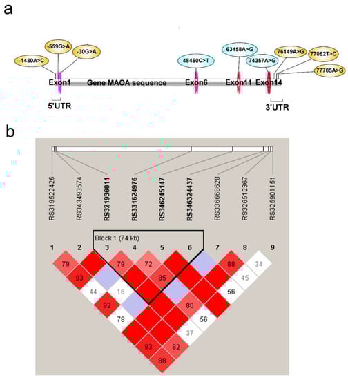 3.3.1. MAOA Gene Polymorphism and Aggressive Behavior and Linkage Disequilibrium (LD) Analyses