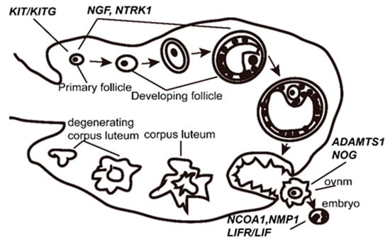 - Driancourt, M.; Reynaud, K.; Cortvrindt, R.; Smitz, J. Roles of KIT and KIT LIGAND in ovarian function. Rev. Reprod. 2000, 5, 143–152. [Google Scholar] [CrossRef] [PubMed]