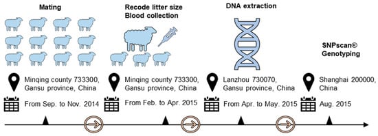 Increasing litter size is critical for intensive sheep production system (house feeding). Two sheep breeds, Hu sheep and Small-tailed Hans sheep were selected in this study because these two breeds are widely used in China for their high fecundity. In the current study, all ewes (Hu sheep and Small-tailed Han sheep) were raised under the same management conditions and were mated from September to December 2014, which was a short-day period in Minqing, Gansu province, China. Blood samples of 957 ewes with litter size recorded at first parity from February to April 2015 were collected at Minqing Zhongtian Sheep Industry Co., Ltd. (Minqing, Gansu Province, P.R. China), including 537 Hu sheep and 420 Small-tailed Han sheep. The experimental protocol across times was shown in Figure 2. Data for the phenotype of litter size records in Hu sheep and Small-tailed Han sheep are shown in Figure 3. The litter size ranged from one to five in Hu sheep and one to four in Small-tailed Han sheep. The average litter sizes in Hu sheep and Small-tailed Han sheep were 2.21 and 1.93. Genomic DNA was extracted using a phenol-chloroform method [] and then dissolved in double-distilled water and stored at −20 °C.