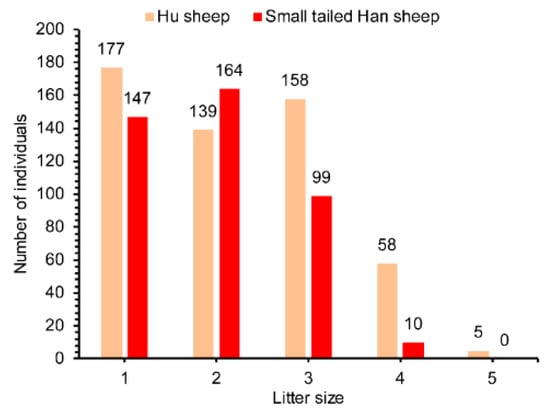 Frequency distribution of litter size in Hu sheep and Small-tailed Han sheep.
