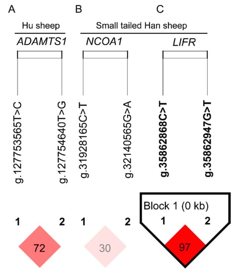 In the current study, only the significant SNPs in the same gene in each sheep breed were used to estimate the extent of linkage disequilibrium (LD) and haplotype blocks. Two significant SNPs (ADAMTS1: g.127753565T>C and ADAMTS1: g.127754640T>G) in Hu sheep and four significant SNPs (NCOA1: g.31928165C>T, NCOA1: g.32140565G>A, LIFR: g.35862868C>T and LIFR: g.35862947G>T) in Small-tailed Han sheep meet this precondition and were used for further analysis. The extent of LD between significant SNP pairs and haplotype blocks was estimated using the Haploview 4.2 software []. The model of association analysis between combined haplotypes and litter size was as follows in Formula (1) except that the genotype (G) was replaced by combined haplotypes. Numbers less than 12 of the combined haplotypes were excluded from the association analysis.