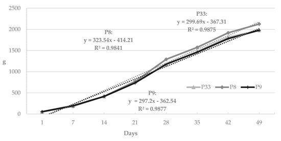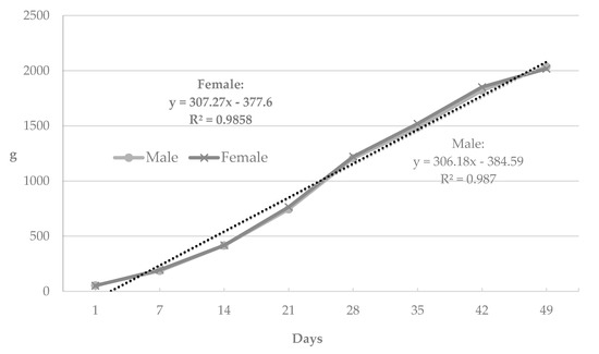 Figure 1 presents the curves illustrating body weight changes in the compared lines of the ducks. The shape of the curves was close to linear, and weekly body weight gain ranged from 297.20 to 323.54 g, depending on the line. It is also worth noting that up to 21 days of age, the birds of the studied lines showed a very similar growth. Starting from 3 weeks of age, P33 ducks exhibited a more dynamic body weight increase compared to P8 and P9 ducks—the dynamics of growth in these lines was highly similar. The curves in Figure 2 show practically the identical dynamics of changes in the body weight of drakes and ducks from 1 to 49 days of age, with the weekly body weight gain in the compared sex groups ranging from 306.18 (males) to 307.27 g (females).