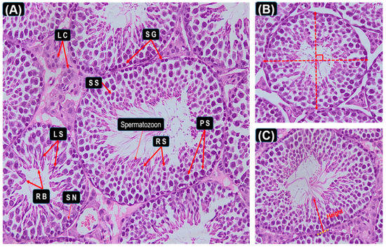 To determine effects on reproductive system development, testis was collected and fixed in 10% cold neutral buffered formalin overnight and then changed to cold 70% ethanol. Tissues were then processed for histology, embedded in paraffin, and cut at 5-μm thickness. The obtained tissue sections were collected on glass slides, deparaffinized and stained by hematoxylin and eosin stain for histopathological examination. Five sections of testis from each of three different doses were observed for the histological changes in the seminiferous tubules as the previous method reported [28,29,30,31]. (Total of 30 sections were observed from each mouse). The diameter of a seminiferous tubule was defined as the shortest distance when the length of the outer edge of the tubule measured by two vertical measuring scales is equal (Figure 1B). The seminiferous epithelial height was defined as the shortest distance between the germ cell which is closest to the center of the lumen and the basement membrane (Figure 1C).