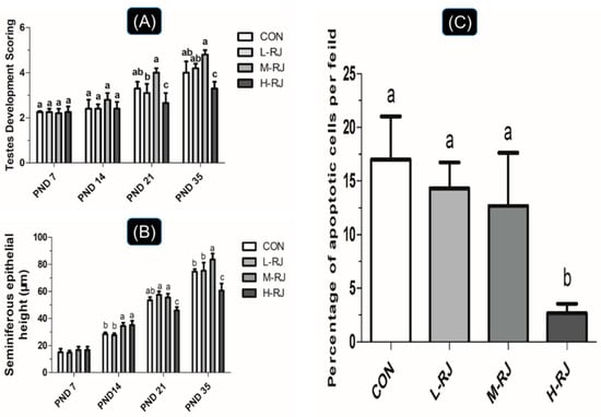 After thoroughly observation and assessment of micrographs among different groups, the result of score for each group showed in Figure 2A. The score of “M-RJ” group mice was higher than CON group (p < 0.05) while a reduction of scoring in “H-RJ” group was statistically significant (p < 0.05) compared with CON on PNDs 21 (Figure 2A). In addition, mice supplemented with H-RJ (500 mg/kg/day) showed a significant decrease (p < 0.001) in testis scoring compared with CON on PND 35 (Figure 2A), which indicated that the spermatogenesis development of the testis under H-RJ treatment maybe not in healthy condition. However, the number of scoring evaluation of mice in M-RJ group was increased compared with CON group (p = 0.057). Corresponding to the microscopic observation and findings perspective, testis in H-RJ group seems to be less significant (p = 0.057).