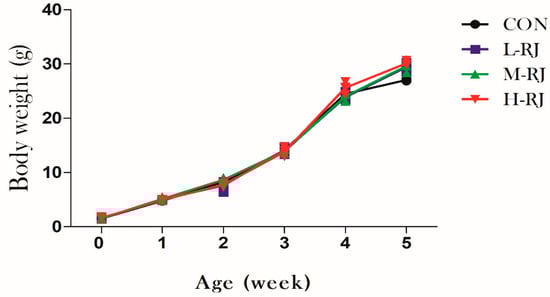 After the oral exposure to freeze-dried royal jelly for 35 consecutive days, the body weight of treated groups mice was increased gradually by week until they were sacrificed. The average body weight in this experiment increased from 1.5 g at day 1 to 28.5 g at day 35 in control and treated groups. However, the data showed no statistical significantly different among the treated and CON groups respectively (Figure 3).