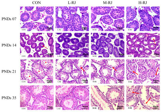 Effects of different doses of freeze-dried RJ on the histoarchitecture of seminiferous tubules at Post-Natal Days (PNDs 07, PNDs 14, PNDs 21 and PNDs 35) in mice. The images pasted with letter “CON” represent mice in control group, showing the normal features, the images pasted with letter “L-RJ”, ”M-RJ” and ”H-RJ” represent low dose of freeze-dried royal jelly treatment group, moderate dose of freeze-dried royal jelly treatment group and high dose of freeze-dried royal jelly treatment group, respectively. For each group and each stage, we captured three representative images. At PNDs 07, images were captured at the magnification of 40×. Bar 20 μm. Testis images of PNDs 14, PNDs 21 and PNDs 35 mice captured at the magnification of 20×. Bar 50 μm. Red arrows in PNDs 14 indicate the space of seminiferous tubules. Red arrows in PNDs 21 (L-RJ, M-RJ) indicate the seminiferous epithelium. Red arrows in PNDs 21 (H-RJ) indicate the abnormal space in the basal part of the seminiferous epithelium. Red arrows in PNDs 35 (H-RJ) indicate the un-synchronously seminiferous epithelium. Different markings inside the images were inserted through Adobe Photoshop CS5.