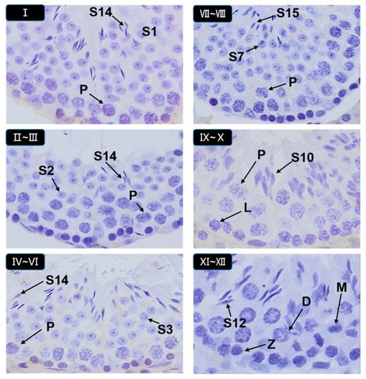 Images in Figure 5 and Figure 6 were used as a handy reference for recognizing the stages and assessing the development of the testis considering our scoring criteria collectively (Table 1). These micrographs showed the histopathological changes at the phases of seminiferous tubules and diverse stages in the cycle of spermatogenesis (Figure 5. Hematoxylin staining of seminiferous epithelia at stages I–XII.). The arrangement micrographs of Figure 5 were evaluated by light microscopic examination under 20× magnification, presented as some common examples and helped to distinguish different type of germ cells respectively. Micrographs of Figure 6 were evaluated under 100× magnification. Special figures and characters were donated according to the staging method defined for laboratory mouse [32,37].