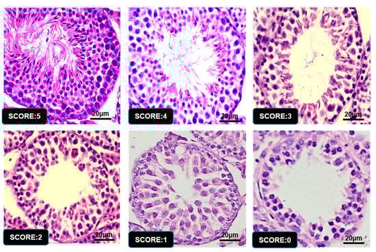 The organization of the seminiferous tubule has been studied frequently in rodent species [32]. Each cell type of the cell association in cross-sectioned seminiferous tubules is morphologically integrated with the others in its developmental processes. Based on the examination of cross-sectioned seminiferous tubules, spermatogenesis and steps of spermatogenesis can be known clear [29,33,34,35]. Our assessment of spermatogenesis is based on Johnsen’s method [36]. Testicular morphology in all groups were observed by light microscope and represented the most frequently observed structural changes inside the seminiferous tubules. Briefly, the Scoring method applies a grade from 0 to 5 to each tubule cross section according to the following criteria (Table 1). The mean testis scoring was calculated for 100 seminiferous tubules per group.