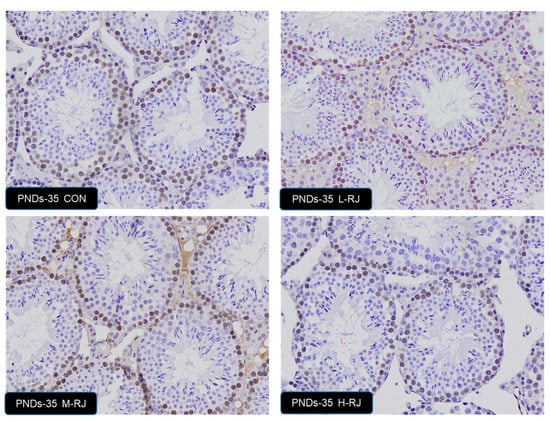 To explore the role of different level of dietary royal jelly on germ cell growth in testis, the proliferation detection of germ cell was carried. We used PCNA-specific antibodies to visualize the cells undergoing DNA synthesis. In CON group testis, strong PCNA positivity was detected in the spermatogonia and some types of spermatocytes, which suggest active cell proliferation (Figure 7). The PCNA-positive spermatogonia were arranged regularly and were located near the basement membrane in control group mice. Similar results were found in L-RJ and M-RJ testis. After oral H-RJ administration, less PCNA-positive cells were detected and they were not arranged regularly. The statistics result not significantly changed among the groups. The stages of PNDs 7, PNDs 14, PNDs 21 and PNDs 35 not showed statistically differences.