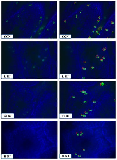 Administration of RJ reduced apoptosis in the testis. Apoptosis analysis of the CON and treatment groups. From top to bottom are the testis of CON, L-RJ, M-RJ and H–RJ, the left column showed apoptotic figures among groups, the right column were apoptotic cells in the figures which was labeled by IMAGE -PRO 6.0. Data collected using a Nikon DS-U3 system and Image-Pro Plus6.0 software. Statistical analysis was performed using Student’s t-test. Magnification: 40x.