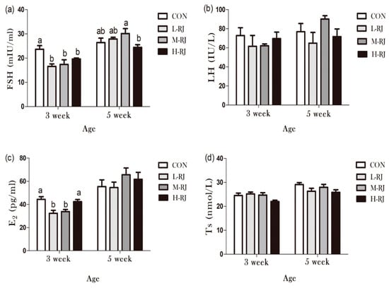 Reproductive hormones secretion level of pubescent male mice exposed to oral freeze-dried royal jelly. Data are shown as mean ± SE (n = 7) and different letters (a,b,c) within a column represent significant (p < 0.05) differences among groups. Some abbreviated letters indicate the following: Follicle Stimulating Hormone (FSH), Luteinizing Hormone (LH), Estradiol2 (E2) and Testosterone (T).