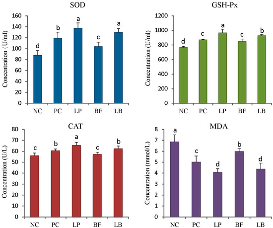 Piglets from the Lp and LB group had higher SOD activity than that of the NC, pC, and BF group (p < 0.05). The activity of GSH-px and CAT of Lp group were higher than that of other four groups (p < 0.05). The GSH-px activity of LB group was higher when compared with the NC, pC, and BF group (p < 0.05). Compared with the NC, pC, and BF group, the MDA content of weaned piglets from the Lp and LB group was decreased (p < 0.05, Figure 1).