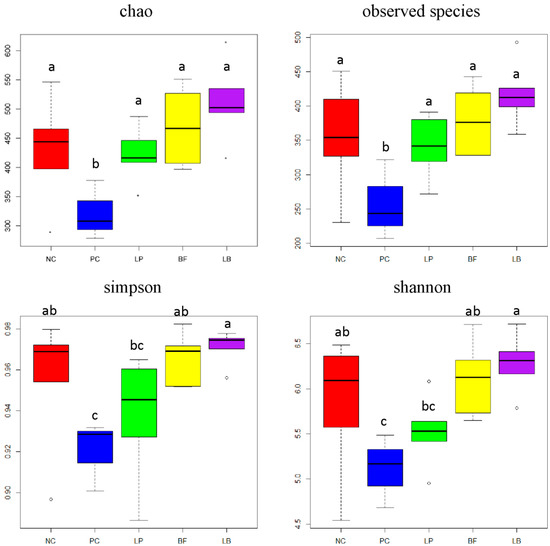 The saturation plateau of rarefaction curves and species accumulation curves indicated that sampling had sufficient coverage and depth to accurately describe the bacterial composition of each group (Figure S1). The OTU number of pC, NC, Lp, BF, and LB was 264, 361, 348, 386, and 424, respectively. The pC and NC groups had lower OTU numbers compared with other groups (p < 0.05). The community diversity index of Chao and Observed species was different (p < 0.05) between the pC group and other groups in weaned piglets (Figure 2). The Simpson and Shannon index showed no difference between the pC and Lp group, but differed significantly with other three groups.
