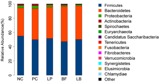 At the phylum level, 15 phyla were identified in the samples from the fecal samples of weaned piglets (Figure 3 and Table 5). Five groups showed similar taxonomic compositions at the phylum level, which were dominated by Firmicutes, Bacteroidetes, Proteobacteria, and Actinobacteria. However, the relative abundance of those phyla varied considerably among the five groups (Table 4). The Firmicutes and Bacteroidetes dominated in all the treatment groups. The phylum Proteobacteria and Actinobacteria were more prominent in samples taken from the BF and LB groups when compared with the Lp, pC, and NC groups.