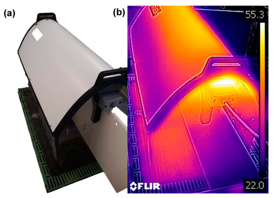 Picture of semi-enclosed heated microclimate (SEHM) for creep area supplementary heat with heating element and enclosure that rest on the creep area divider between two farrowing stalls (a). Thermographic image (scale units = °C) of a SEHM at operational conditions (b).
