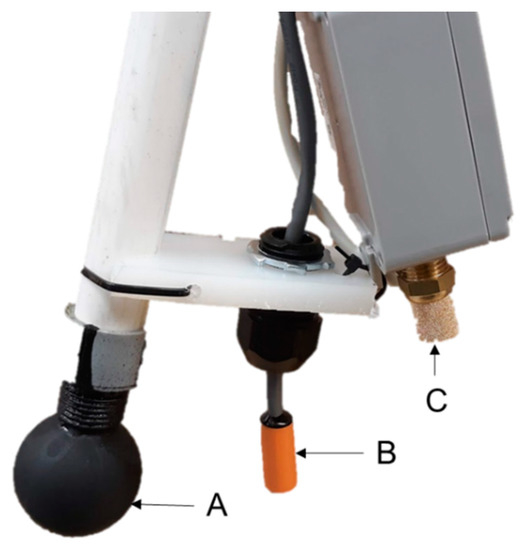 A thermal environment sensor array (TESA; modified from Ramirez et al., 2018 [9]) was constructed for the specific application in this study (Figure 2). Dry-bulb temperature (DBT; F Temp, ControlTech, Bondurant, IA, USA) and relative humidity (RH) sensors (WHT-310, Dwyer, Michigan City, IN, USA) were deployed in key locations, discussed further in this section (Figure 3). A black globe temperature (BGT) sensor was constructed with a DBT sensor (F Temp, ControlTech, Bondurant, IA, USA) placed inside the center of a 5.1 cm diameter copper sphere or a 3.8 cm diameter table tennis ball; both painted flat black. Both types were used due to corrosion of the copper spheres in the high moisture environment, which led to spheres breaking in half. For each type, globes were attached to a 1.27 cm long threaded pipe coupled to a 1.52 cm long PVC pipe with a cord grip on the opposite end to seal the globe enclosure.