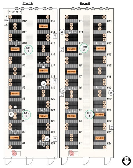 Layout of the two adjacent farrowing rooms (A and B) where the SEHMs were installed. Locations of TESAs for creep area instrumentation and room DBT/RH sensors are identified.