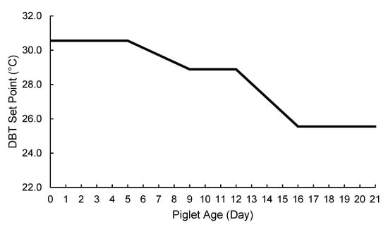 Dry-bulb temperature (DBT) set point curve by piglet age that was used to control the proportional output of the SEHMs.