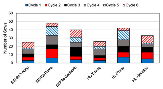 For six farrowing cycles, 113 litters (SEHM treatment) and 101 litters (HL treatment) were farrowed and weaned for this analysis. There were 25 SEHM litters and 37 HL litters excluded from this study due to sow mortality, sow health, and piglet mortality data quality.