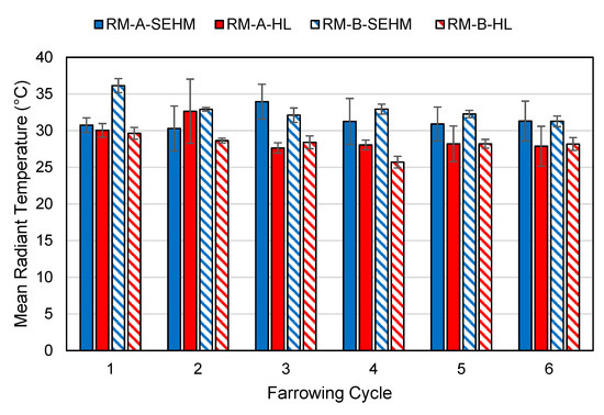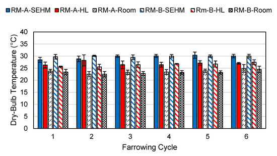Data were downloaded at the conclusion of each farrowing cycle for all micro-/macro-environment sensors and the SEHM control data. Custom software (Python 3.7, Python Software Foundation, Wilmington, DE, USA) developed in an integrated development environment Project Jupyter (2015), processed and organized the data [10]. The date range for each creep area TESA was the date of farrowing at midnight to 08:00 on the day of weaning. Mean radiant temperature was calculated using BGT and DBT assuming only natural convection [11]. Data were averaged across all SEHM, HL, and room locations to determine average DBTs and RHs for the SEHM, HL, and room for each room for all six farrowing cycles.