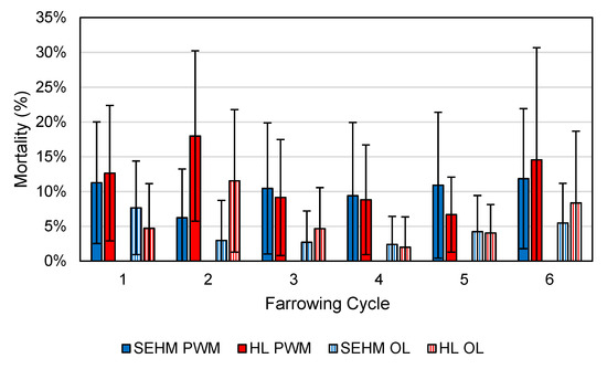 Pre-weaning mortality (PWM) and over-lay mortality (OL) percentages over six farrowing cycles for the two heat source treatments, SEHM and heat lamp (HL). Error bars represent one standard deviation of the farrowing cycle mean. This data represents the raw results, and thus, no statistical analysis between cycles was performed.